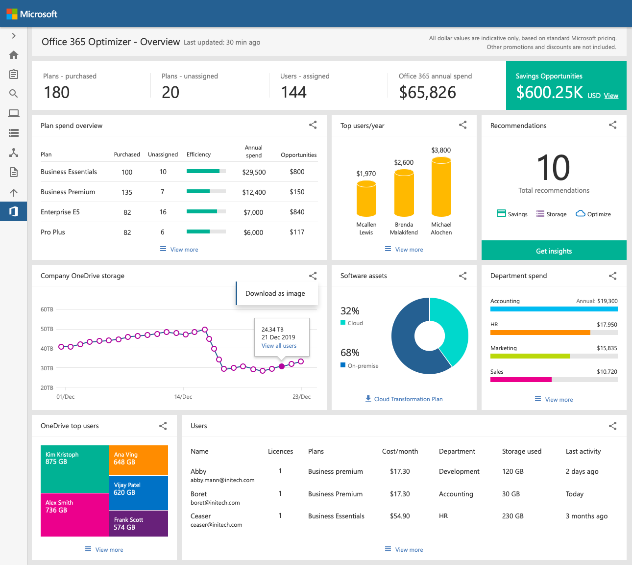 The Microsoft Cloud Optimizer allows IT professionals to track the spend, usage, efficiency and waste of their Office 365 software. Insights into ownership, storage, savings opportunities and software environment are brought together in a single, well organized, easy to read dashboard for complete visibility and control. The challenge was to create something useful from an IT manager's point of view. By continuously listening, testing and iterating with end users, we were able to identify and satisfy a specific customer need, which created a positive business outcome.